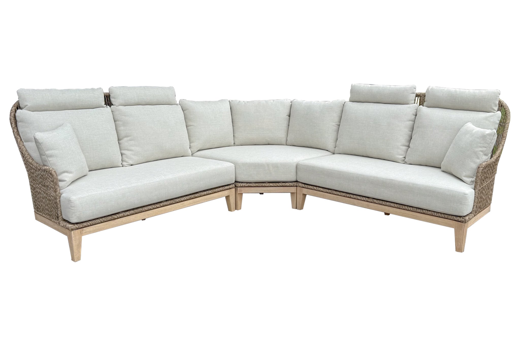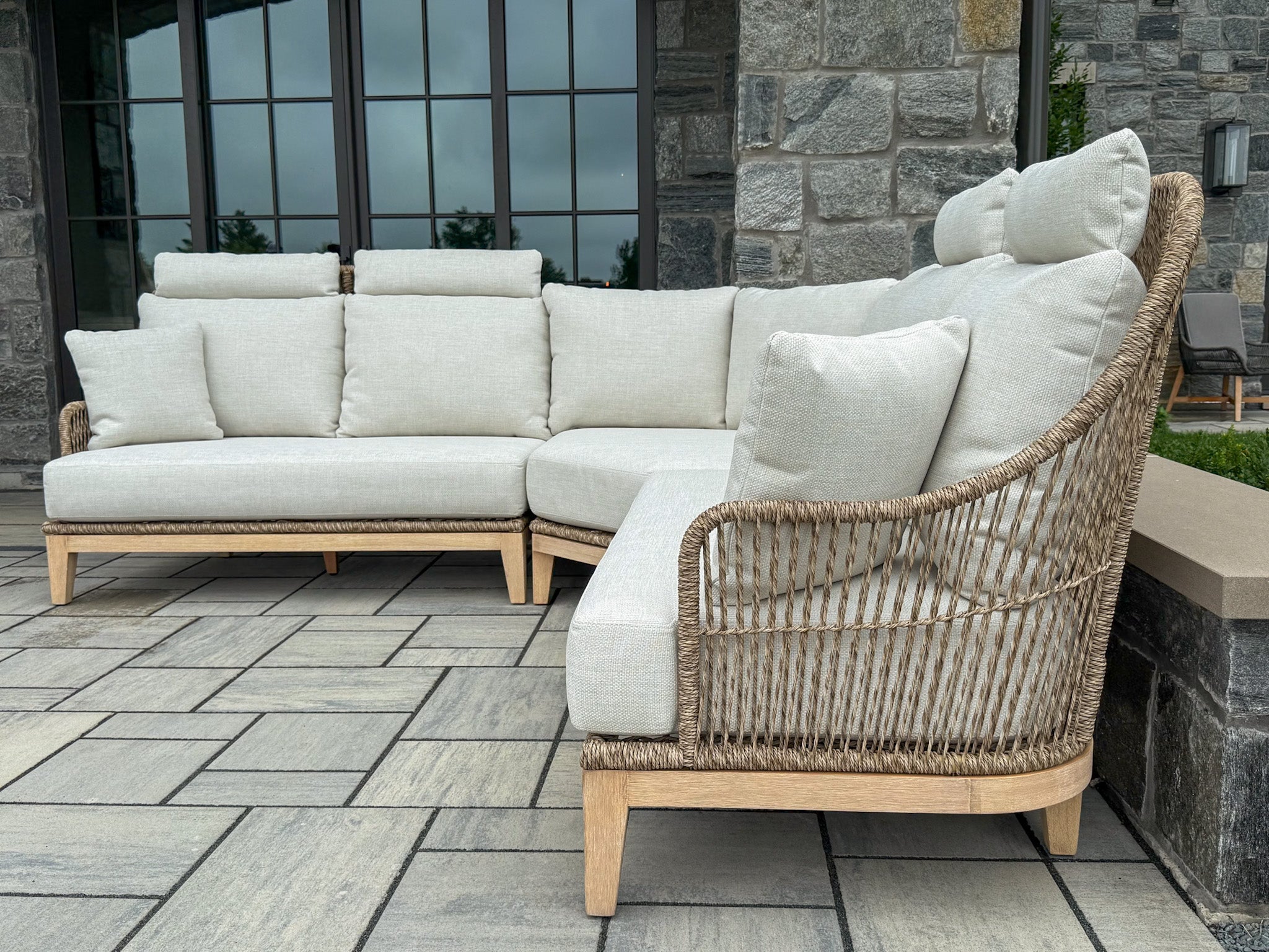 This sectional combines comfort and durability with HDPE all-weather wicker and antique-washed eucalyptus hardwood, offering lasting strength and refined texture. Generous seating with high-back Olefin cushions provides both support and style, making it ideal for entertaining or relaxed lounging. A statement piece that brings timeless elegance to any outdoor space.