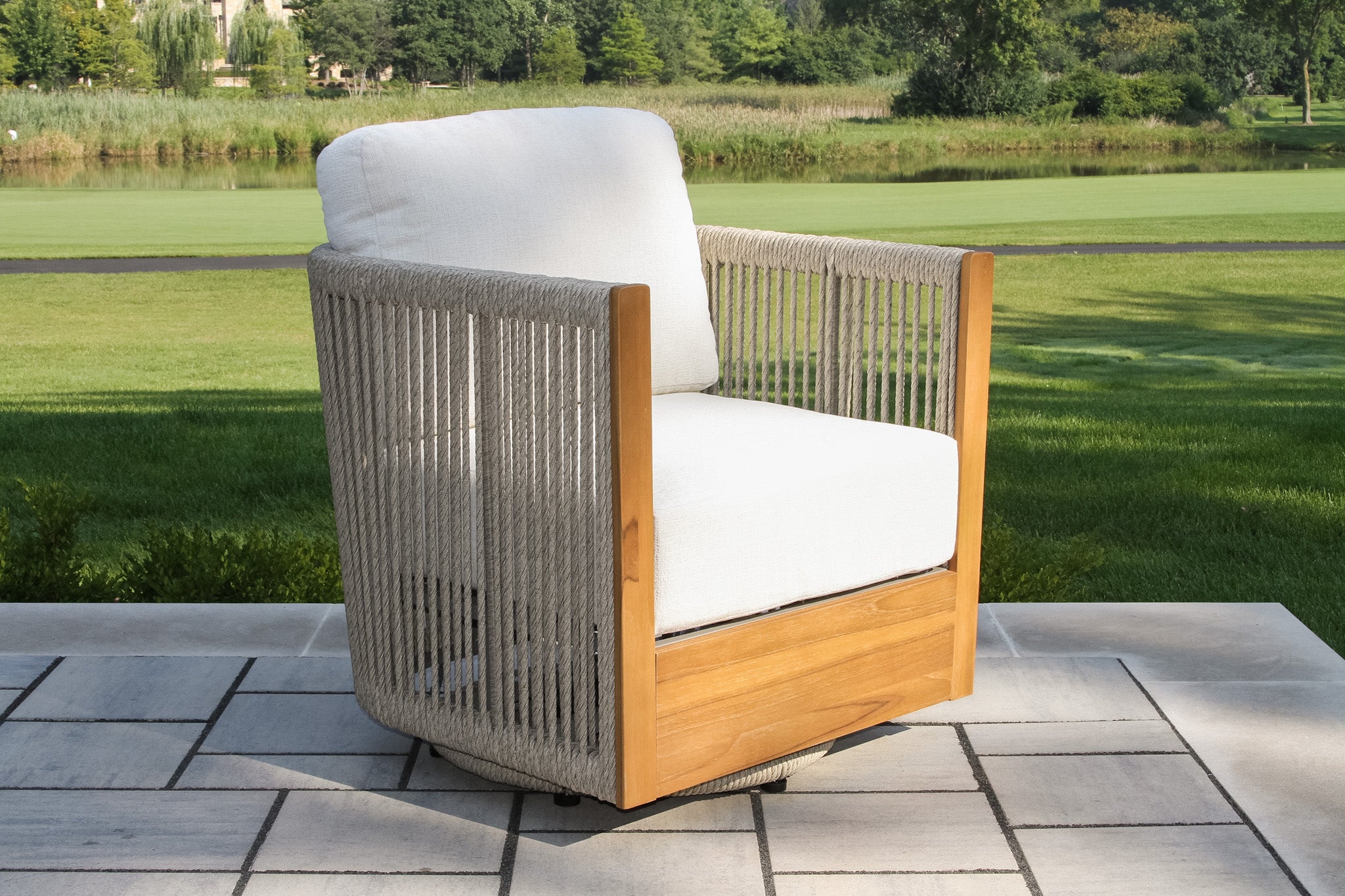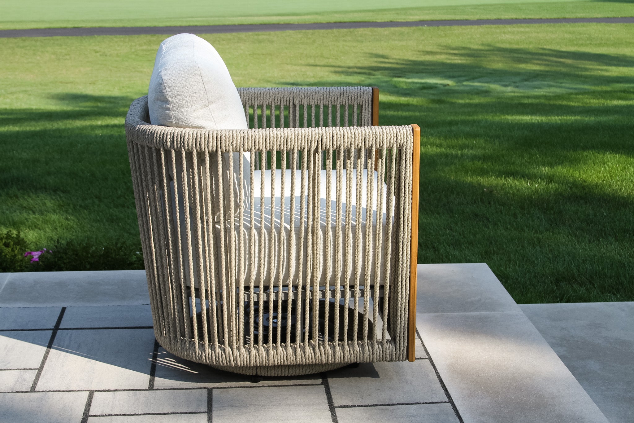 This swivel chair combines versatility with elevated comfort. Its 360° swivel base and plush, full-height cushions create a relaxed yet refined seating experience. Constructed from FSC® certified teak and HDPE wicker on a powder-coated aluminum frame, this piece balances modern durability with natural warmth - perfect on its own or paired with the matching sofa and coffee table.